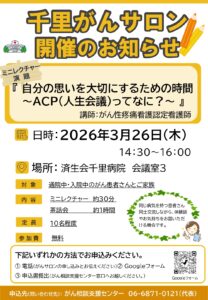 | 千里がんサロン | 3/26(木) | 14:30~16:00 | 当院に通院中のがん患者さん、そのご家族 | 災害管理棟1階 会議室3 | 詳細はこちら |